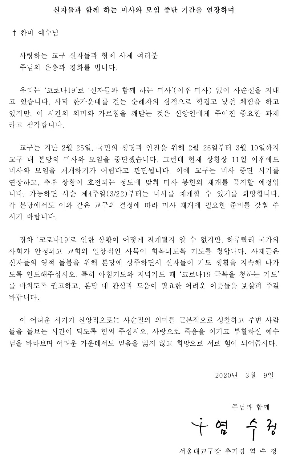 (코로나19) 신자들과 함께 하는 미사와 모임 중단 기간을 연장하며